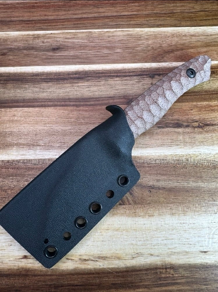 6.63" (16.84cm) overall. 2.75" (6.99cm) black oxide coated 80CrV2 carbon steel Wharncliffe blade with stone grind. Tan canvas micarta handle. Full tang. Black Kydex sheath , no clip included must add your own style preferred clip. USA MADE